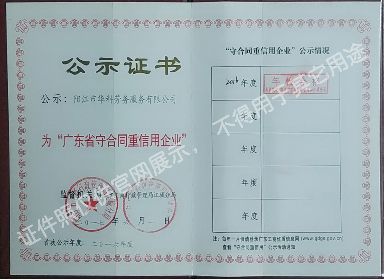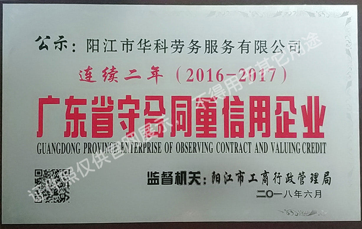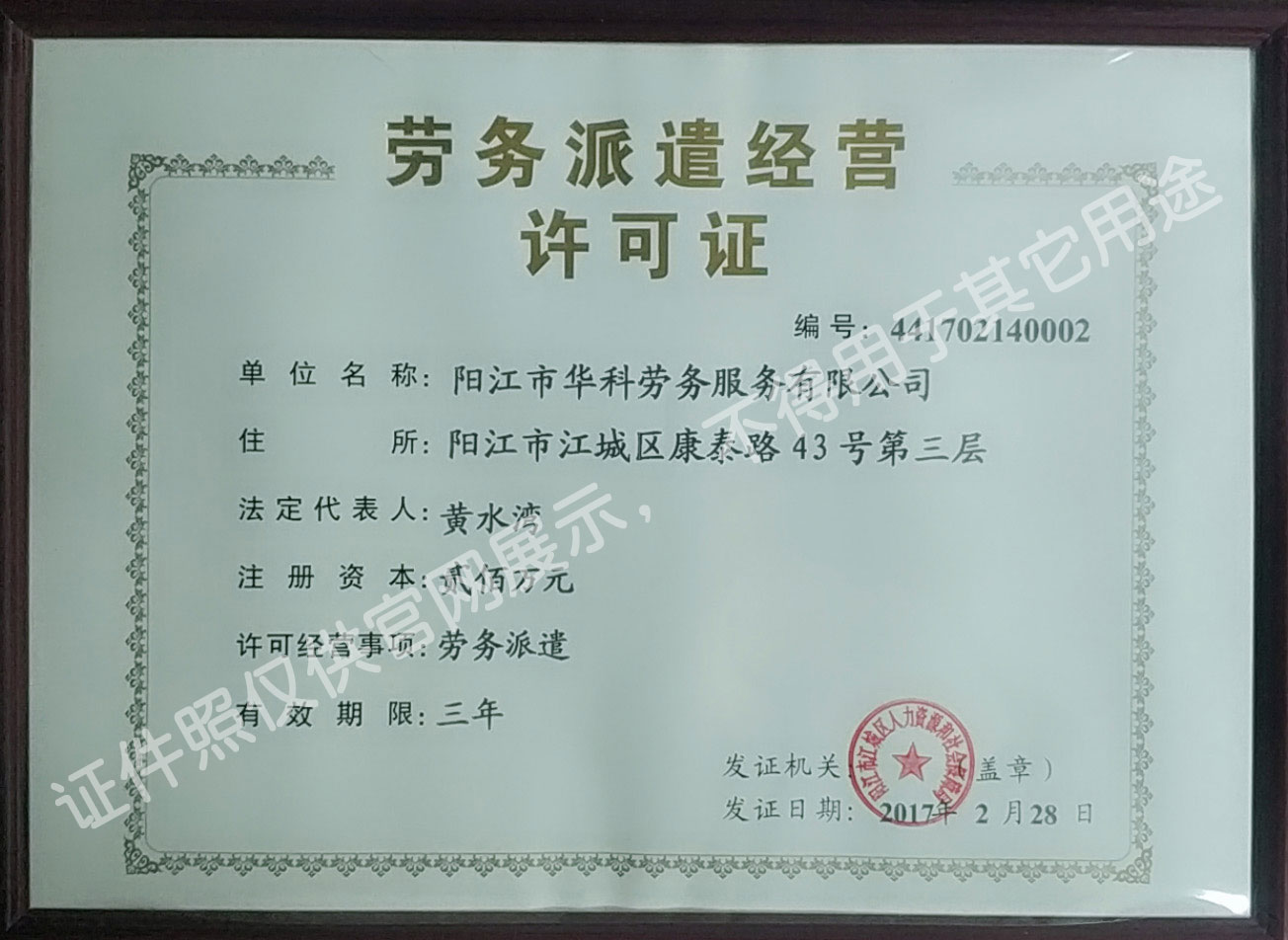 陽(yáng)江市華科勞務(wù)服務(wù)有限公司是專(zhuān)業(yè)從事勞務(wù)外包、人事代理、勞務(wù)租賃、人力派遣及管理的綜合性服務(wù)機(jī)構(gòu),是首批獲得廣東省人力資源廳、陽(yáng)江市勞動(dòng)和社會(huì)保障局頒發(fā)人力資源許可證的合法單位?!罢\(chéng)信務(wù)實(shí)、專(zhuān)業(yè)熱情、滿(mǎn)意第一、服務(wù)社群”的經(jīng)營(yíng)理念,在勞務(wù)派遣業(yè)務(wù)的基礎(chǔ)上,更致力于合同制工人(臨時(shí)工、實(shí)習(xí)生、假期工)方向發(fā)展,為用工企業(yè)及時(shí)輸送合格的各類(lèi)人才,合理調(diào)配人力資源的有序流動(dòng),幫助求職者尋求更加滿(mǎn)意的就業(yè)渠道和崗位,切實(shí)維護(hù)求職者的合法權(quán)益。
